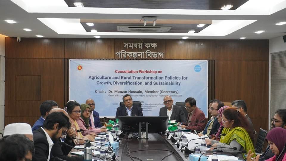 A consultation workshop on “Agriculture and Rural Transformation: Policies for Growth, Diversification and Sustainability” was held at GED yesterday. The aim of this workshop is to receive feedback from relevant ministries and stakeholders. A presentation was made by Dr. KAS Murshid, former DG, BIDS and head of Economic Taskforce. We aim to publish a policy brief on the topic to facilitate evidence-based policymaking through incorporating inputs in the medium-term and long-term policy strategy of the government.